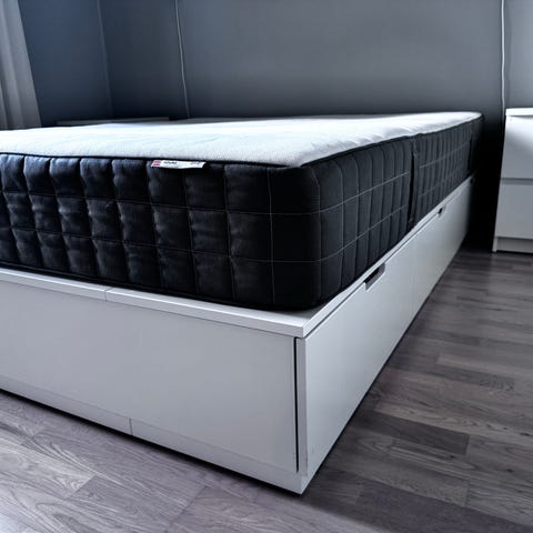 IKEA säng NORDLI 90x200 cm med förvaringslådor. Sängen har en madrass ovanpå en sängram med inbyggda utdragslådor undertill för extra förvaring. Lådorna är placerade på sidorna av sängen och öppnas framåt, vilket ger plats för till exempel sängkläder, kläder eller andra textilier. Passar i sovrum där man vill kombinera sovplats med praktisk förvaring under sängen. Madrassen är från IKEA och är en fast pocketresårmadrass av märket VÅGSTRANDA.