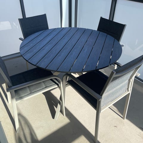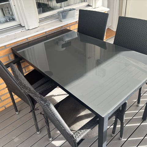 Trädgårdsbord/Balkongbord i nyskick. 90x90x64. Bordsskivan i grått konstträ och benen i grå metall. Köpt hos Mio