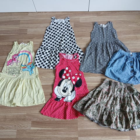 klädpaket med massa kläder: bodisar, pyjamas, tröjor, klänningar, byxor, jeans, koftor,...., srorlek 104/116 för de flesta
