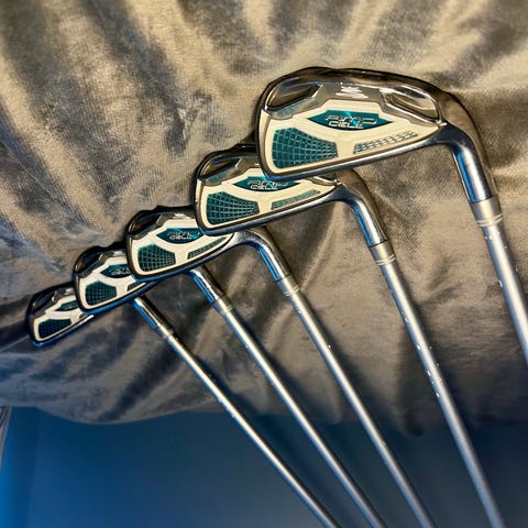 Skick: Klubborna är i mycket bra begagnat skick. Finns normalt bruksslitage på träffytor och sulor efter spel, men inga stora hack eller skador som påverkar prestandan. Alltid väl rengjorda efter rundor.