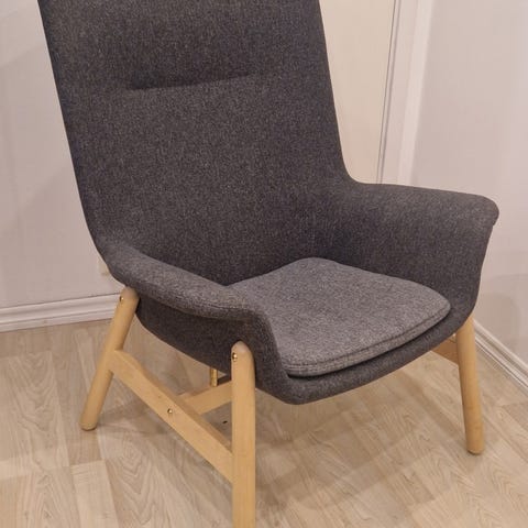 VEDBO fåtölj från IKEA i färgen Gunnared mörkgrå. Ca 3 år gammal men i gott skick då den stått på landet och bara använts några få gånger per år.