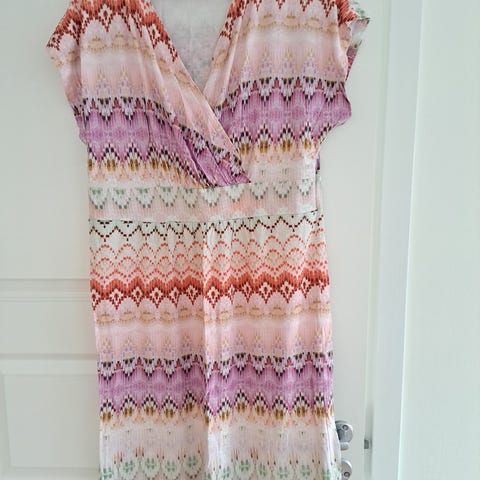 Lila kort klänning med blommönster och urgröpt rygg. Väldigt lätt och skön, passande till sommaren. Stl. M.