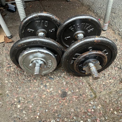 Hantelset med två hantlar på 1 kg styck. Hantlarna är rosa och har ett överdrag i neopren som ger ett greppvänligt ytskikt. Passar för lätt styrketräning, rehabilitering och hemmaträning.