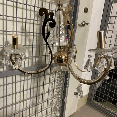 En klassisk ljuskrona i rokokosti. Glas/ kristallprismor.