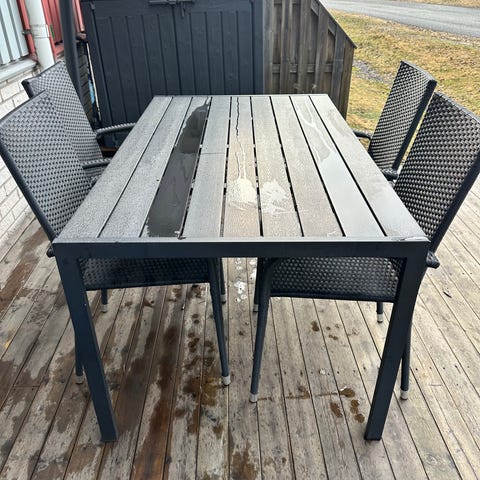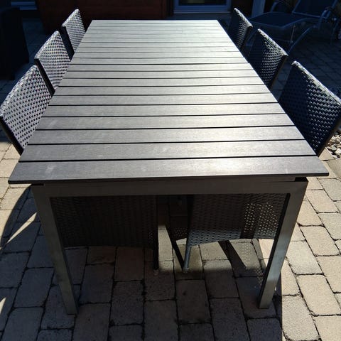 Matgrupp utomhus bord och 6 stolar svart trä från IKEA