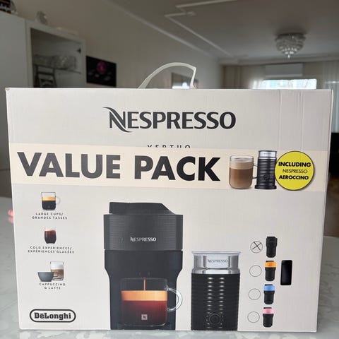 Maskinen är designad för att brygga kaffe med Nespresso Vertuo-kapslar.
