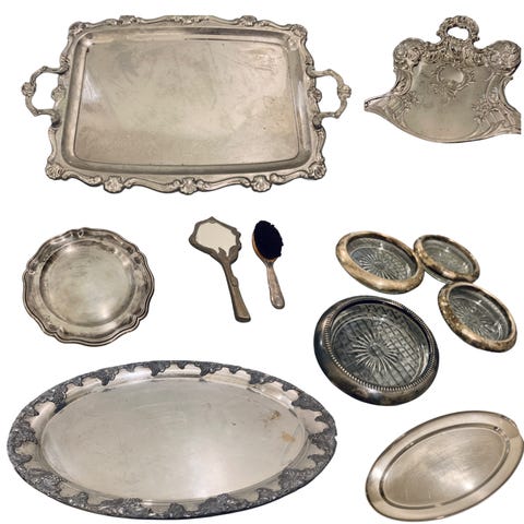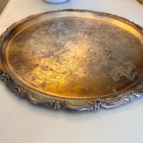 Fatet sÀljs oputsat och har en tydlig, genuin patina. Som syns pÄ bilderna finns det flÀckar och skiftningar i silverytan (oxidering och visst bruksslitage). Detta ger fatet en rustik karaktÀr som passar perfekt för dig som Àlskar "shabby chic" eller vill ha en inredningsdetalj med historia. Inga stora bucklor eller skador.