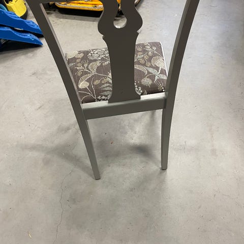 Totalrenoverad stol! Ny stoppning på sits och omklädd i ett väldigt vackert tyg. Stolen är målad i en antracitgrå matt mineralfärg. Allt arbete utfört av möbeltapetserare.