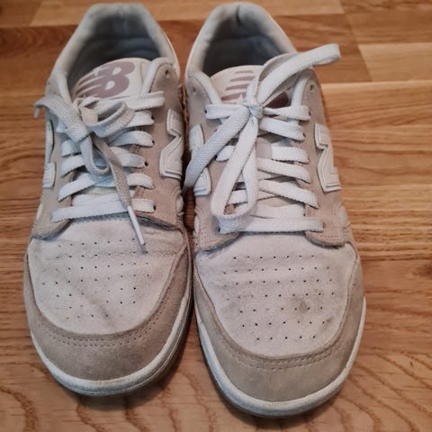 Ett par gråa Nike sneakers med vita skosnören och vit sula. Skorna har en vit Nike-logotyp på sidorna och på plösen. Sulan är vit med en svart rand.
