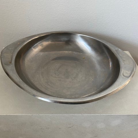 Tallrik i rostfritt stål. Rund modell med låg kant, lämplig som serveringstallrik eller bricka för mat, snacks eller bakverk. Metallmaterialet gör den slitstark och enkel att rengöra. Diameter ca 19 cm.