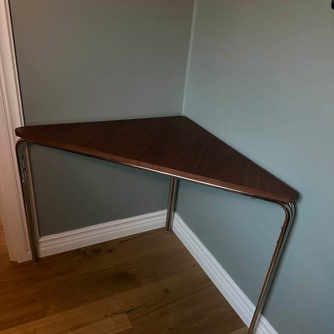 Hörnskrivbord i vit och träfärgad laminat. Skrivbordet har en större arbetsyta i vinkel samt en lägre del med öppna hyllplan och tre lådor med handtag. Passar för hemmakontor, studierum eller arbetsplats där man behöver både arbetsyta och förvaring. Materialet verkar vara träskiva med laminatyta i vit och trästruktur.