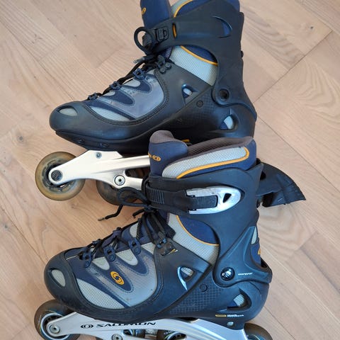 Salomon inlines rullskridskor i storlek 42. Modellen har hård yttersko med justerbara spännen och manschett runt vristen. Flera hjul per skena ger bra rull och stabilitet vid åkning på asfalt och andra hårda underlag. Färgkombination i svart, gult och grått med Salomon-logotyp på sidorna. Passar för träning, motion och transport inom rullskridskor och inlinesåkning. Kommer med stavar med metall-piggar.