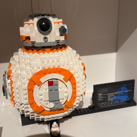 Lego Star Wars R2-D2 byggsats i vit och grå färg. Modellen föreställer droidekaraktären R2-D2 och består av flera detaljerade delar som monteras ihop till en utställningsmodell. Passar för display i hylla eller som del av en större Star Wars-samling av Lego.