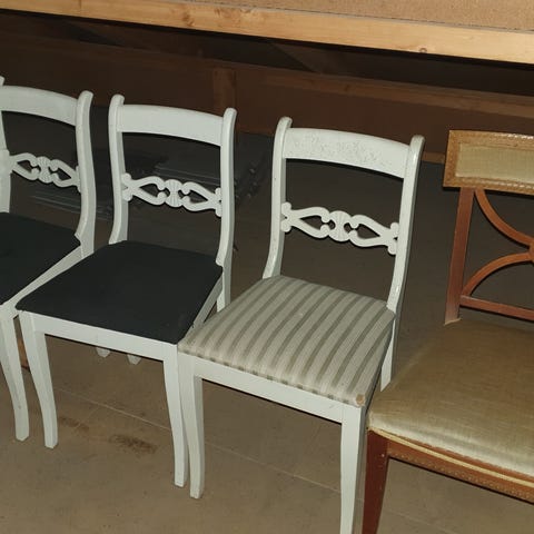 Säljer här 6 stycken stolar. Det är två bruna i trä, två guldmålade i trä samt två vita i plast. Dom har stått ute i ett förråd så behöver göras rent, men är annars i fint skick. Dom är hela och kompletta är inga fel på dom.