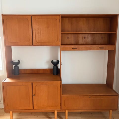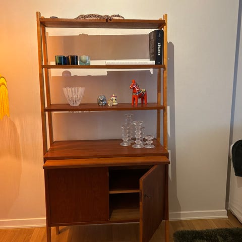 Säljer en fin teakhylla med smidigt utdragbart skrivbord.