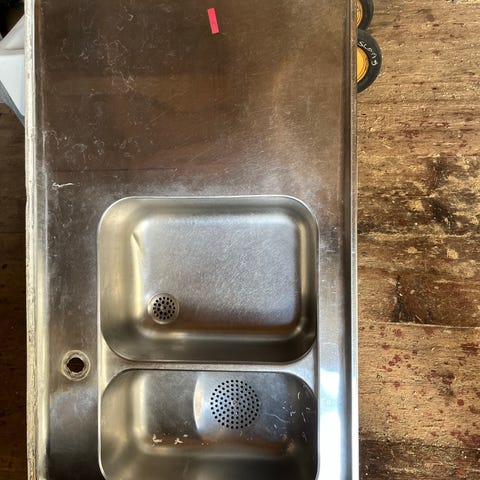 Diskbänk i rostfritt stål med integrerad ho. Underdel med ett skåp med dörr samt två trådbackar i metall på öppen ställning. Arbetsyta och ho är i rostfritt material, stomme och skåpsdel i målad plåt. Passar exempelvis i garage, tvättstuga eller enklare köks- eller arbetsutrymme. Viss rost och slitage förekommer på hyllplanet inne i skåpet enligt bild.
