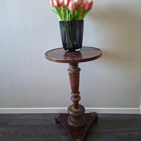 Sidobord i trä med runt bordsskiva i brun ton. Bordet har svarvat mittben och trekantig fot med tre ben. Passar som piedestal, avlastningsbord eller litet soffbord i exempelvis vardagsrum eller hall. Ytan visar tydliga spår av användning och slitage på både skiva och underrede.