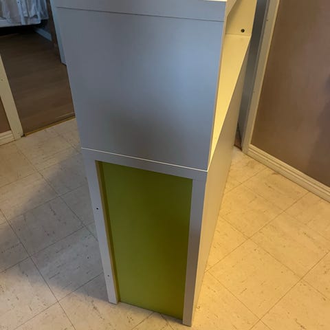 IKEA barnbokhylla i vit färg med grön baksida. Hyllan har ett öppet övre fack och ett större nedre parti som kan användas för förvaring av böcker, leksaker eller spel. Sidorna är släta och hyllan är anpassad för barnrum med låg höjd på hyllplanen så att barn lätt kommer åt sina saker. Passar som sänggavel eller mot vägg i barnrum, lekrum eller vardagsrum som förvaringsmöbel för barnens saker.