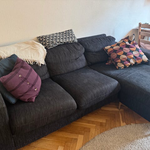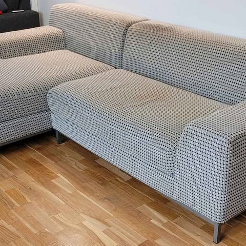 Soffan är i bra skick - den enda skavanken är under en av sittdynorna: min hund slet tyvärr sönder tyget där, så det är nu tejpat fast. Dock kan man varken se eller känna det.
