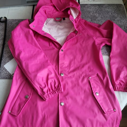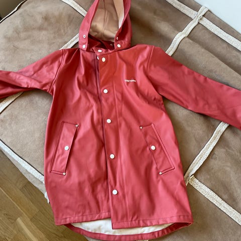 Tretorn regnjacka för barn i storlek 128. Jackan är rosa och tillverkad i polyester. Modellen är unisex och har huva, tryckknappar framtill samt fickor med knäppning. Materialet är slätt och vattenavvisande, med insida i mjukare tyg för ökad komfort. Passar som ytterplagg vid regn och fuktigt väder. Avtagbar luva.