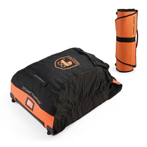 Stokke PramPack resefodral till barnvagn i orange färg. Fodralet är utformat för att skydda barnvagn under resa och kan rullas ihop för enklare förvaring när det inte används. Justerbara remmar och spänne hjälper till att hålla innehållet på plats.