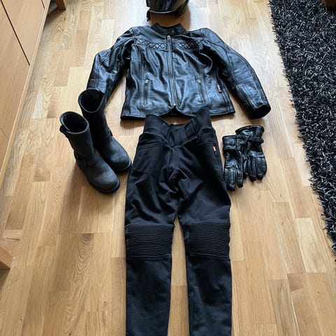 Mc kläder dam, mycket välvårdat. Skinnjacka, Skinnbyxor, boots, hoodie och jeans i kevlar, flera olika handskar, hjälm, regnställ, väst, Bionic skyddsväst dam.