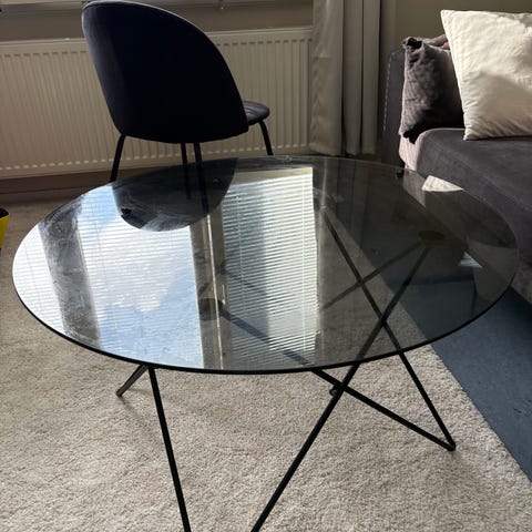 Ett lite trekantigt gråtonat soffbord säljes. Några repor i glaset finns men är svårt att få med på bilderna. Ett fint bord som passar bra till en divansoffa. Säljes p g a flytt.