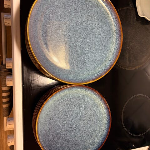 Blått keramikservis set med flera delar. Servisen består av tallrikar, skålar, mugg och en mindre kanna med lock. Delarna har ljusblå basfärg med mörkare blå dekor i mönstrade band och fält. Passar för servering av varma och kalla drycker samt mat, exempelvis frukost, fika eller vardagsmiddagar.