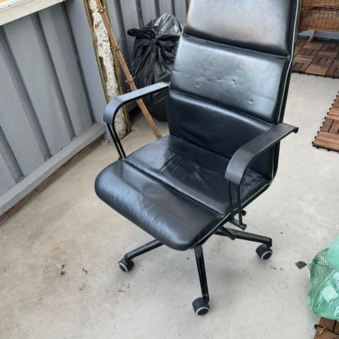 Svart tyg med vita sömmar. Stolen har femhjuligt underrede, armstöd och är höj- och sänkbar. Tyvärr saknas nackstödet.