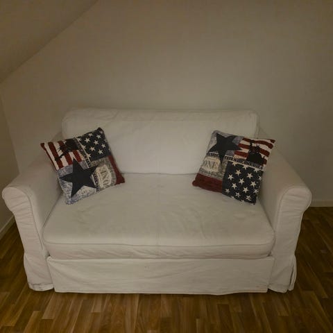 Bäddsoffa säljes finns en blå fläck i överdraget och ett pyttelitet hål