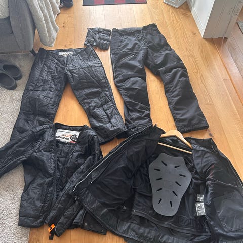 Bering Man motorcykelställ för herr i storlek M. Stället består av jacka och byxa i svart textilmaterial med reflexdetaljer. Jackan har flera ytterfickor och justerbara remmar i midjan. Avsett som skyddande klädsel vid motorcykelkörning.