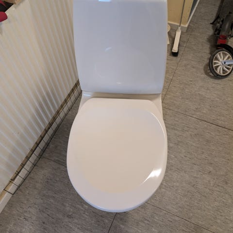 Vit toalettstol i porslin med matchande vit toalettsits. Klassisk modell med golvmontering (ej inbyggd). Toalettskålen har spricka invändigt enligt bild. Oanvänd sits är förpackad i plast. Passar för installation i badrum eller toalettutrymme där standardtoalett önskas. Inkluderar toalettstol och lös sits, övrigt installationsmaterial ingår inte om det inte framgår av annonsen.