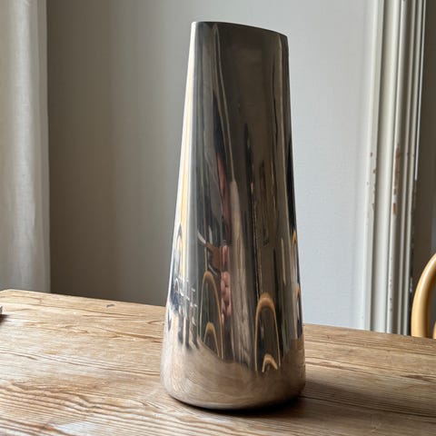 Dekorativ vas i silverfinish. Vasen har en hög, slank form med en kvadratfot och en lätt böjd kropp. Ytan är blank med strukturerad och delvis droppliknande dekoration, vilket ger ett skulpturalt uttryck. Lämplig som dekorationsföremål på en hylla, bokhylla eller bord, med eller utan blommor eller grenar. Mått ca 29x6x5 cm.