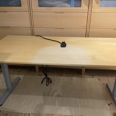 Höj- och sänkbar skrivbordsställning i svart färg, avsedd för att placeras ovanpå ett befintligt skrivbord. Övre hyllplanet rymmer en datorskärm, medan det nedre planet är anpassat för laptop eller tangentbord och mus. Konstruktionen ger möjlighet att växla mellan sittande och stående arbetsställning. Passar för kontor, hemmakontor eller andra arbetsplatser där man vill justera arbetshöjden utan att byta skrivbord.