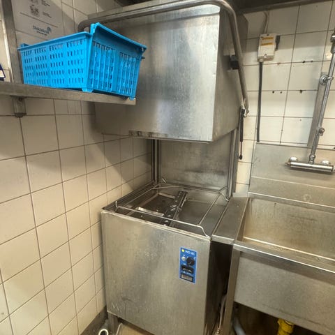 WD-6 huvdiskmaskin i rostfritt stål. Maskinen är avsedd för professionellt bruk i exempelvis restaurang eller storkök. Den har uppfällbar huv för enkel i- och urlastning av diskkorgar samt digital panel på fronten för styrning av diskprogram. Anslutningar för vatten och avlopp finns på baksidan. Maskinen är byggd i rostfritt stål för att tåla fuktig miljö och frekvent användning.