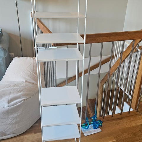 IKEA vägghylla i vit färg med flera hyllplan. Hyllsystemet är väggmonterat med vertikala skenor och lösa hyllplan som kan justeras i höjd. Passar för förvaring av böcker, dekorationer eller kontorssaker i till exempel vardagsrum, sovrum eller arbetsrum. Ytan är slät och lätt att torka av. Viss användning kan förekomma på hyllplanen enligt bild.