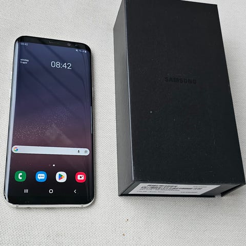Samsung Galaxy S8+ smartphone med 64 GB internminne. Enheten har stor skärm med böjda kanter och fysisk knappfri front. Baksidan är i glas med kamera och fingeravtrycksläsare placerade upptill. Modellen har plats för SIM-kort och stöd för lagring via internminnet på 64 GB. Lämplig för vardaglig användning som samtal, meddelanden, surf, appar och mediauppspelning.