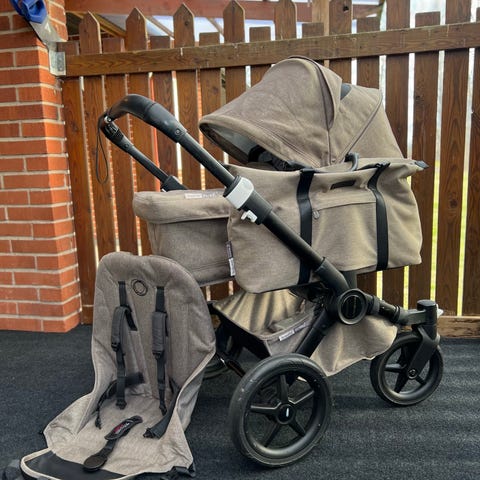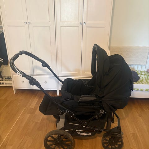 Emmaljunga barnvagn med både liggdel och sittdel. Liggdel i grått tyg och sittdel i svart tyg, båda med sufflett. Liggdelen är i mycket bra skick trots använd av flera barn. Chassi med fyra punkteringsfria hjul och varukorg undertill. Handtag och frontbygel har detaljer i läderimitation, handtaget är slitet (se bild) men påverkar inte funktionen. Adapter till babyskydd och myggnät följer med.