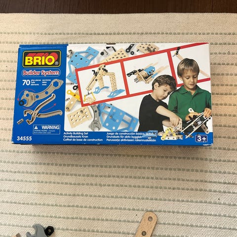 BRIO byggleksak med blandade delar i trä och plast. Innehåller olika byggbitar i trä med hål, klossar, hjul, muttrar, skruvar och verktyg i plast i flera färger. Delarna kan användas för att bygga enkla fordon och konstruktioner och passar för barn som tycker om att skruva, bygga och kombinera olika komponenter.
