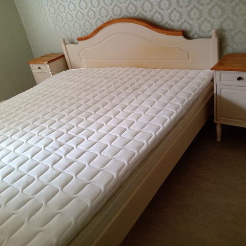 Säng med resårmadrass och tillhörande sängbord.
