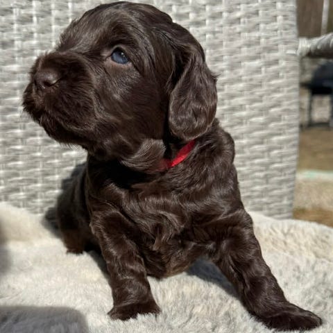 Dessa härligt sociala mysiga valpar är född hos mig, av en mörkbrun med tantecken Cockerpoo tik, F1, som väger ca 11kg, hon är otroligt snäll mot allt o alla o så lättsam o rolig o smart hund 🥰
