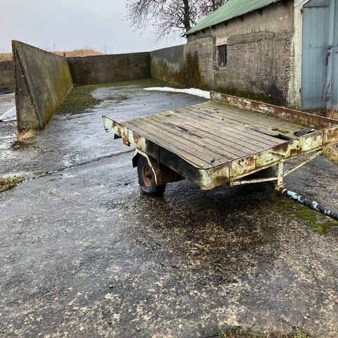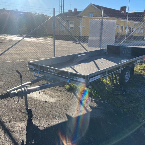 Släpvagn med öppet flak och bromsad axel sitter på Flaket är uppbyggt med träplankor på en ram av metall.