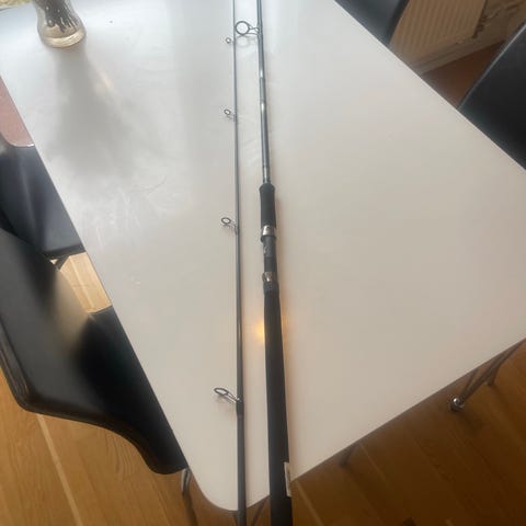 Tvådelat fiskespö med korkhandtag och flera linförande spöringar. Spöt är utrustat med rullfäste men toppöglan är avbruten.