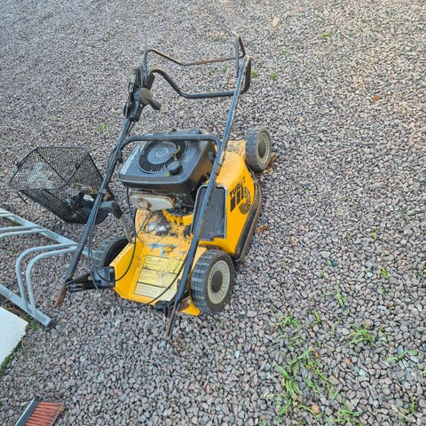 Kärcher högtryckstvätt i gul färg med bensinmotor. Utrustad med handtag och hållare för slang och pistolhandtag. Passar för rengöring av exempelvis fordon, uppfarter och fasader där eluttag inte finns lätt tillgängligt. Slang och sprutpistol ingår enligt bilder. ny olja och stift går bra