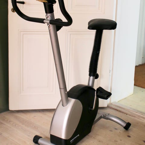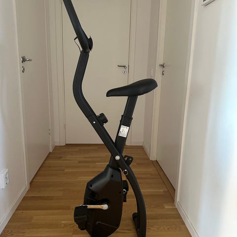 React motionscykel i hopfällbar modell i svart färg. Cykeln har sadel med höjdjustering, pedaler med remmar.