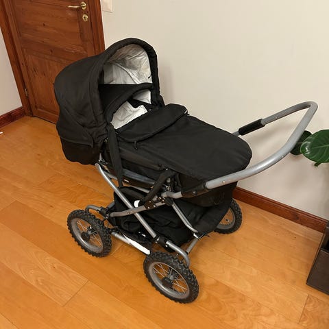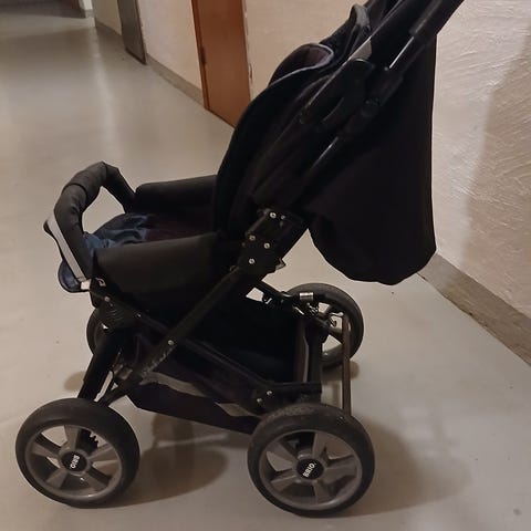 En hel barnvagn med alla delar, en hoppgunga och en bilstol.