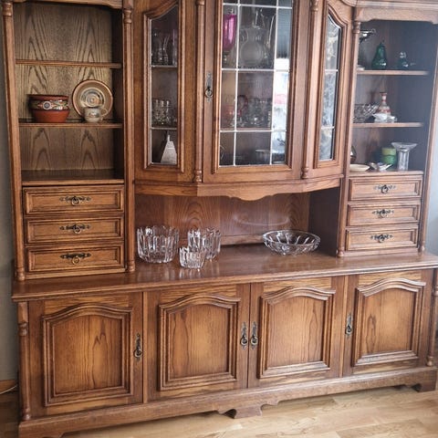 Elegant väggsektion i trä med vitrindel och flera skåp/lådor som ger gott om plats för porslin, glas och prydnader. Stabil och i fint skick – passar både klassisk och modern inredning.