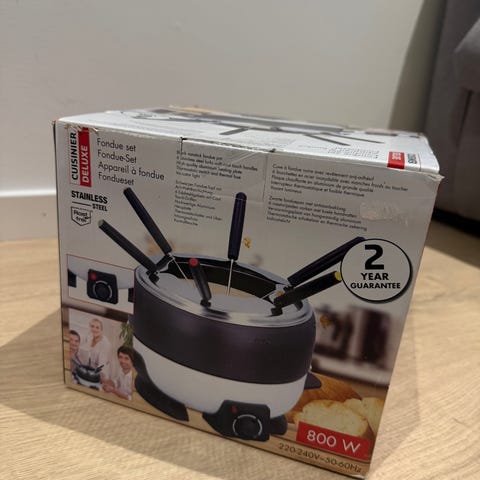 chokladfondue i rosa färg. Elektrisk fonduegryta för smältning av choklad, med vred för temperaturreglering på framsidan. Levereras med tillbehör i form av plastgafflar och spatlar enligt bild. Lämplig för att doppa till exempel frukt, bär eller godis i smält choklad vid fika eller dessertservering.