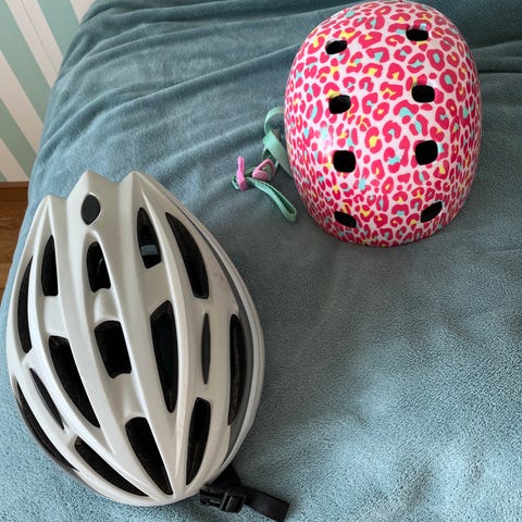 Cykelhjälmar barn blå och vit med rosa mönster