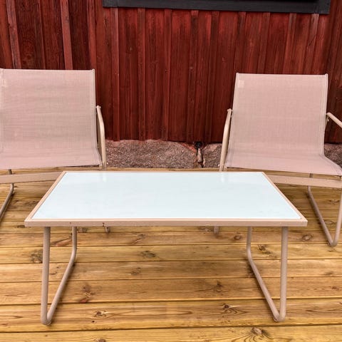 Rektangulärt trädgårdsbord med bordsskiva i glas och underrede i metall. Bordet har hål i mitten för parasoll och en stabil ram med böjda ben. Passar för användning utomhus på altan, balkong eller uteplats. 95x150 cm
